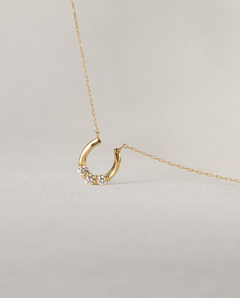 馬蹄鐵在古代被認為是富貴人家才擁有的馬匹所必需的,因此馬蹄鐵也象徵著財富和好運 / 馬蹄形狀也代表著「將幸運留在身邊」和「招來幸福」,因此馬蹄項鍊也被視為傳達祝福和幸運的禮物 / K18黃金色澤溫暖高貴,能長久保持光澤 鑲嵌總重10分的鑽石,每顆鑽石皆經精細切割,確保在光線下呈現高亮度與火彩 / 鑽石共0.1ct 日本製