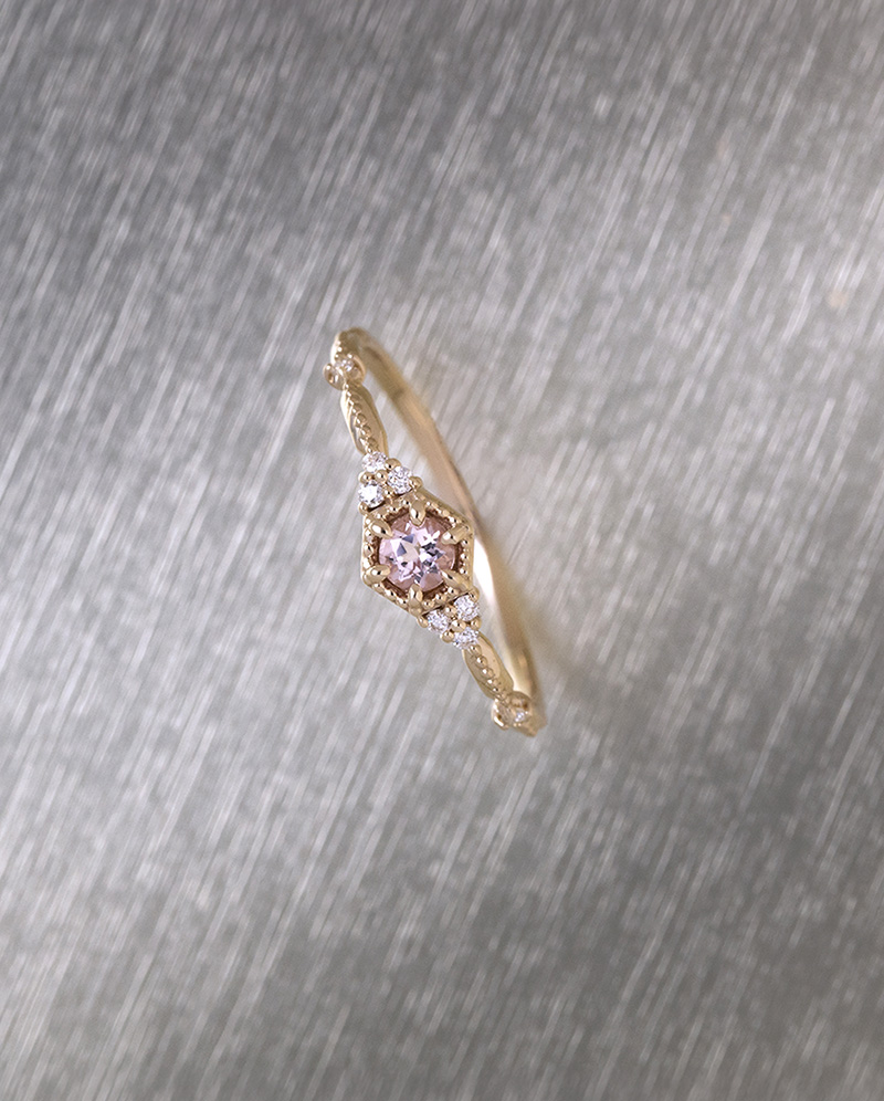 整體設計語彙圍繞著「柔美、古典、神聖比例」,將維納斯象徵的愛與優雅轉化為精緻日常配戴珠寶 / 摩根石本身帶有柔感光澤,在K10暖金色調襯托下顯得更加溫潤,呼應維納斯誕生於海沫的柔光氛圍 / 摩根石:0.1ct 鑽石共0.04ct 日本製