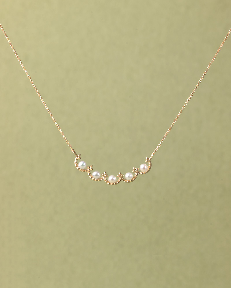 小顆淡水珍珠均勻點綴於花冠節點,形成節奏感與層次 / K10金質花瓣搭配細緻珠邊裝飾,增加復古質感與光影變化 / 每顆珍珠內部皆嵌入K金芯加以固定,使結構更加穩固 造型輕巧、比例纖細,適合日常或疊戴,兼具精緻與實用 / 長度45cm,可自由調節 日本製
