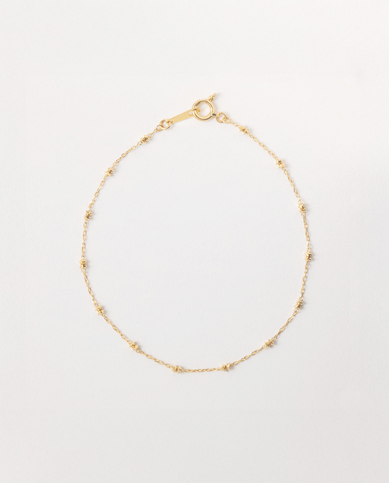 透過切割轉珠在鍊條間有節奏地分布,讓手鍊在動作中產生細緻閃耀 / 小顆轉珠表面經多面切割處理,能有效反射光線,提升K18金質本身的亮度與質感 / 使用纖細但結構穩定的鍊條,兼顧視覺輕盈與實際耐用度 長度:17cm 日本製