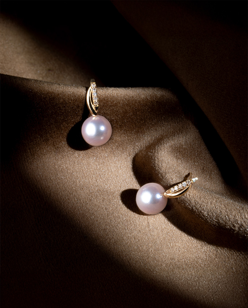 以K18金勾勒細緻松葉線條,微彎的弧度貼合耳際,如自然生長般托起Akoya珍珠 / 所選Akoya珍珠尺寸約7~7.5mm,圓度與光澤表現均衡,呈現細緻的鏡面光感 金屬線條中段配置小鑽,作用在於提升整體立體層次與精緻度,而非作為主視覺焦點,使珍珠仍為視覺重心 / 鑽石共0.025ct 日本製