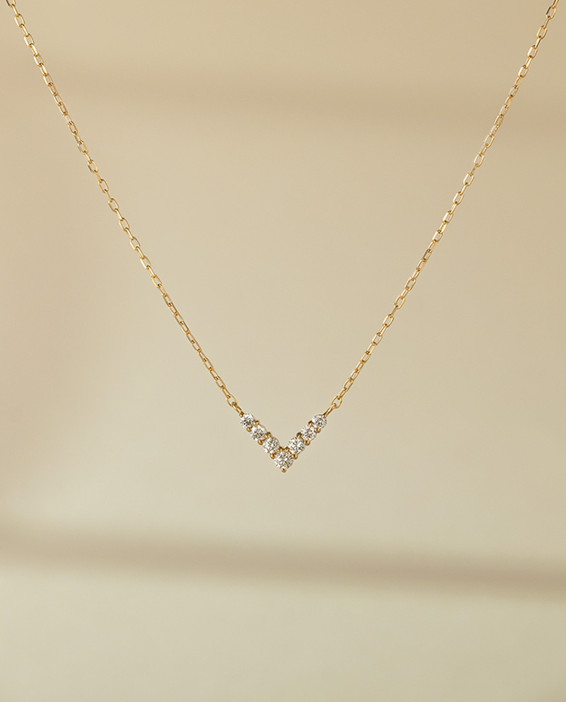 以V字線條作為設計核心,象徵向前、堅定與自我肯定。簡潔俐落的幾何結構,呼應現代女性內斂卻有力量的氣質,透過比例與留白,讓設計在極簡之中保有存在感 / 鑽石沿V字線條細緻鑲嵌,強調立體折角,使光線在不同角度下產生層次閃耀,修飾頸部與鎖骨線條 / 整體重量輕巧,配戴穩定,不易翻轉,適合長時間配戴於日常生活與正式場合之間自由切換 / 鑽石共0.15ct 日本製