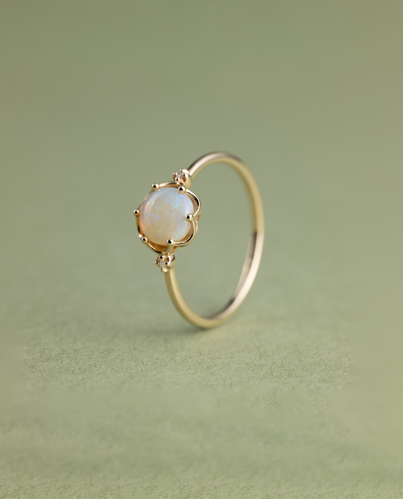 選用帶有乳白基調的蛋白石,光澤柔和,在自然光下浮現淡淡虹彩,如霧中光暈,低調卻富有深度 / 以圓潤花瓣線條包覆主石,爪鑲比例刻意收斂,既保留穩定結構,也讓蛋白石看起來如"被托起的光核" 戒臂側邊加入微小點鑽作為隱約亮點 / 鑽石共0.008ct 日本製
