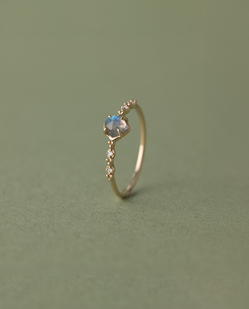 拉長石本身帶有藍色光暈,並非隨時強烈顯現,而是在角度與光線變化下才浮現,設計上刻意避免過於搶眼的鑲嵌,讓寶石成為靜靜存在、卻耐看且有層次的主角 / 側邊銜接四顆小鑽,並以細小金珠作點綴 / 鑽石: 0.02ct 日本製