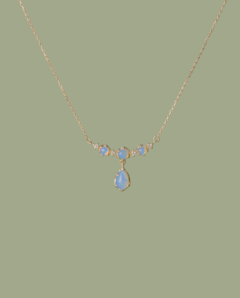 水滴形蛋白石作為視覺焦點,象徵星辰墜落的一瞬光芒 圓形蛋白石橫向排列,如星點散落天際 / 中央下墜式水滴設計,拉長頸部線條 • 上方橫向排列形成穩定視覺基底 • 整體重量分布平衡,配戴時自然服貼、不翻轉 / 蛋白石: 0.31ct 鑽石: 0.02ct 日本製